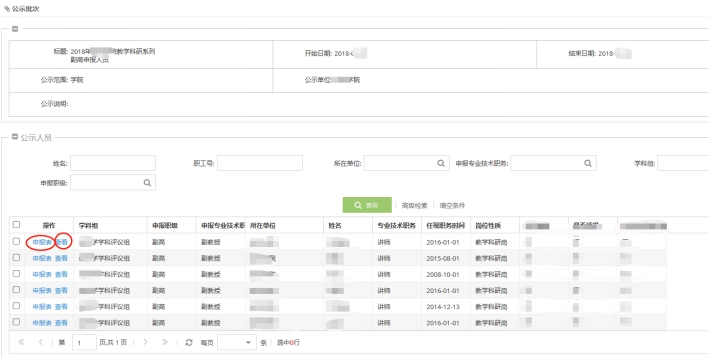 (3)查看公示人员列表,并可通过点击“申报表”或“查看按钮”查看申报人员详细信息。
