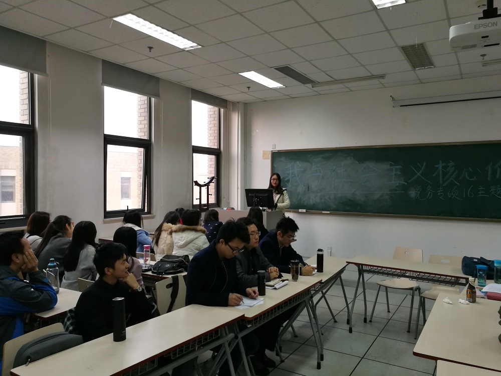 社会主义核心价值观是社会主义价值体系中最基础、最核心的价值观念,是社会主义社会科学发展的价值导向,是马克思主义指导思想和中国特色社会主义共同理想的价值内核,是对以爱国主义为核心的民族精神、以改革创新为核心的时代精神和社会主义荣辱观的价值升华和高度概括。社会主义核心价值观对在校学生的思想和行为起到确定方向、规范引导的作用。鉴于社会主义核心价值观的重要性,2016级税务硕士班委们在辅导员老师的指导下,在11月22日组织了一场以“我与社会主义核心价值观”为主题的班会。