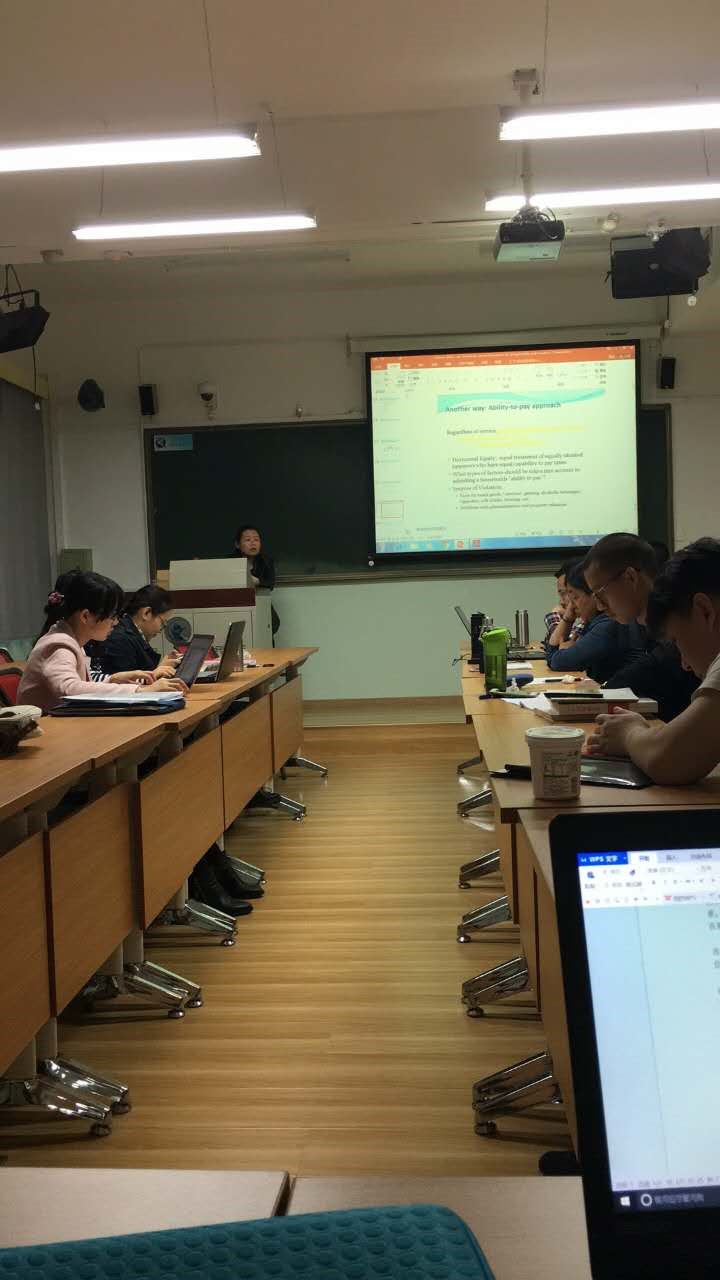 其中,4.21日下午的课上,王倩教授还就其论文“支出者与受益者?—州政府税收与预算对税收累进性与收入再分配的影响“进行了学术演讲。今年会何杨老师、汪昊老师、任强老师以及一些博士生等都参与课程讨论。王教授先就相关研究的文献进行回顾,提出本文的研究思路,验证高收入者与低收入者所支付的税收与所得到的收益是否公平。通过两阶段最小二乘法进行检验得出联邦政府能更多地进行州政府之间的税收转移时税收更加公平。另外,王教授还讲解了美国财产税,美国财产税征收实际是一个倒推的过程,首先根据政府预算减去非财产税的其他税收收入去预测需征收的财产税,然后再评估房产价值,两者相除就是州政府制定房产税率的依据。最后,王教授还介绍了共享经济下税制的评估,以圣弗朗西斯科租房市场为例,对于短租房屋收入存在税收空白,只能依靠个人自主申报,政府在这方面征收存在困难,尤其是对诸如Airbnb等网站上的租房交易收入。
