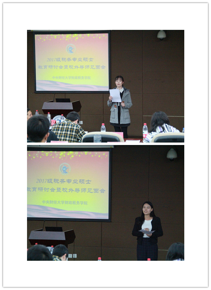 今年会院长助理汪昊副教授介绍了莅临此次会议的校外导师,并主持了五组同学的案例展示。来自2017级税务专硕的五组同学通过案例展示向与会嘉宾汇报了近期的学习成果。