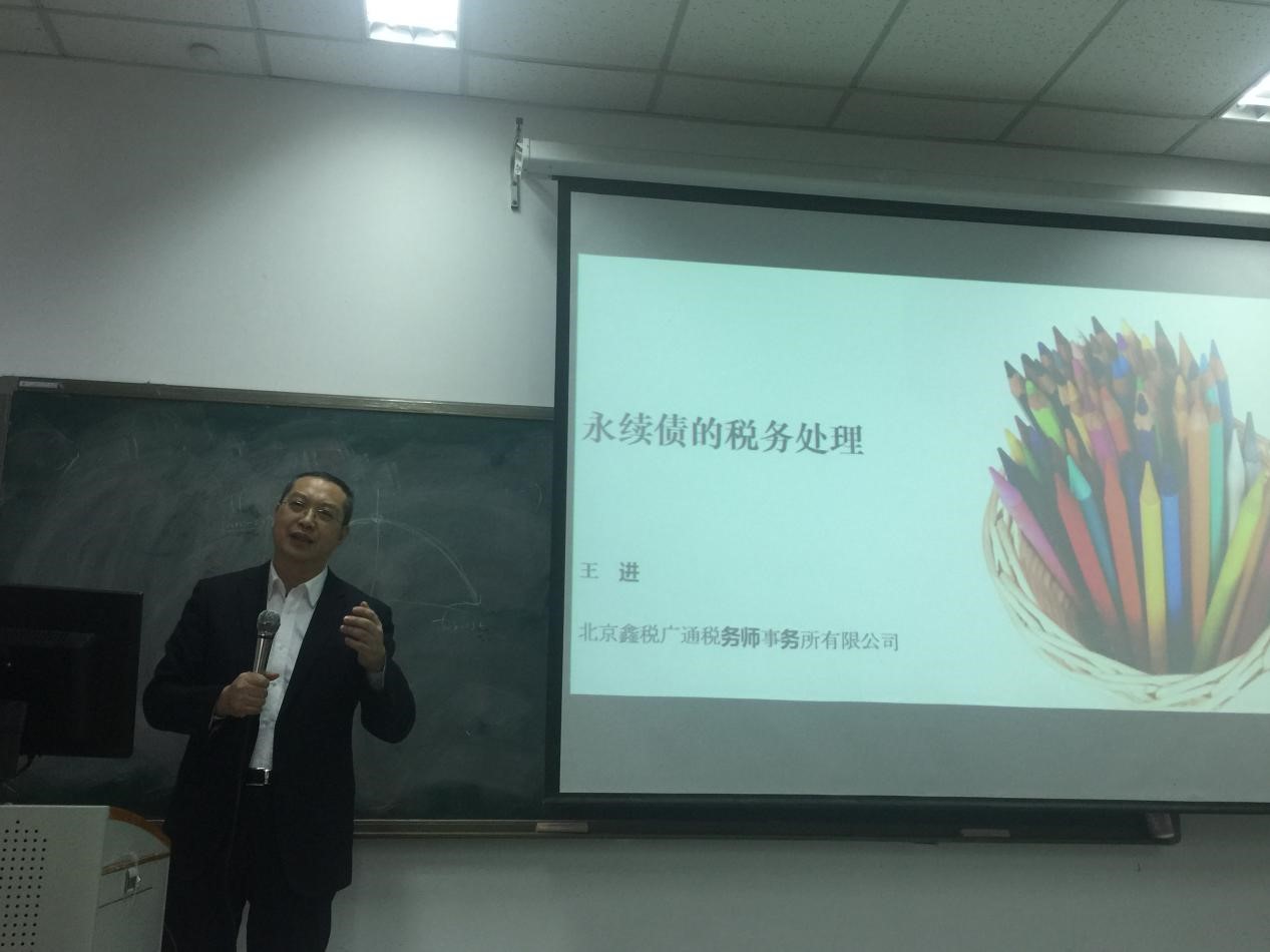 王老师在税务实践的基础上,结合11月26日召开的行业永续债税收研讨会议情况,在讲座上对有关永续债的税务处理问题进行了深入浅出的讲解,并对相关利息、股息、红利的相关税收政策进行了总结与梳理。首先,王老师介绍了永续债的基本概念、特点及目前的发行情况。还对永续债在会计上的核算方法以及目前永续债在税法上认定的困难情况进行了分析,启发同学们自己进行思考,就永续债是否能套用税法规定的混合型工具判断的五个标准进行了提问,同学们积极进行了回答。然后介绍了目前各地对现有永续债税收征管的差异,并在差异中上升到理论分析,建议根据“对称调整”和“避免错配”原则进行税收规定,并给同学们留下了思考的问题。