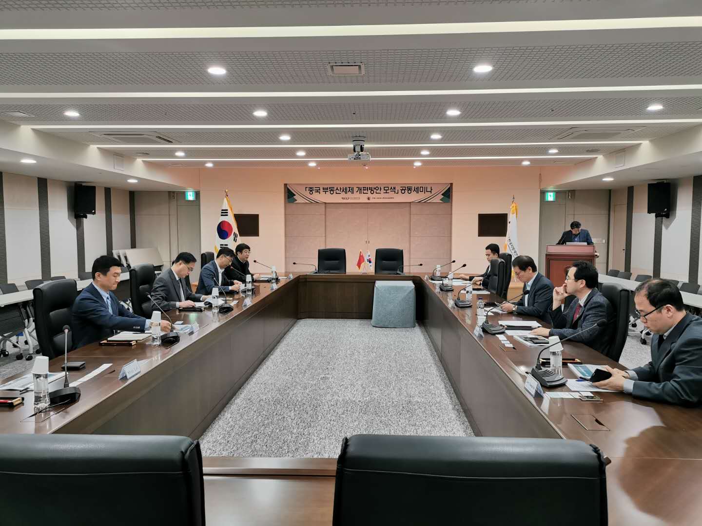 出访团到达韩国地方税研究院,与副院长崔源九教授和赵桂东、Lee Changro、朴相帅、Byeon Seongmin和Kim Hong Hwan等教授进行学术研讨。朴教授十分详细地介绍了“不动产保有税的现况和改革方向”,特别是深入地分析了韩国2018年的综合房地产税改革。课题组成员就土地评估中综合合算、别途合算和分离课税的区别、地方政府债务情况以及综合房地产税中“每世代减免一套”的“世代”定义进行了提问和研讨。