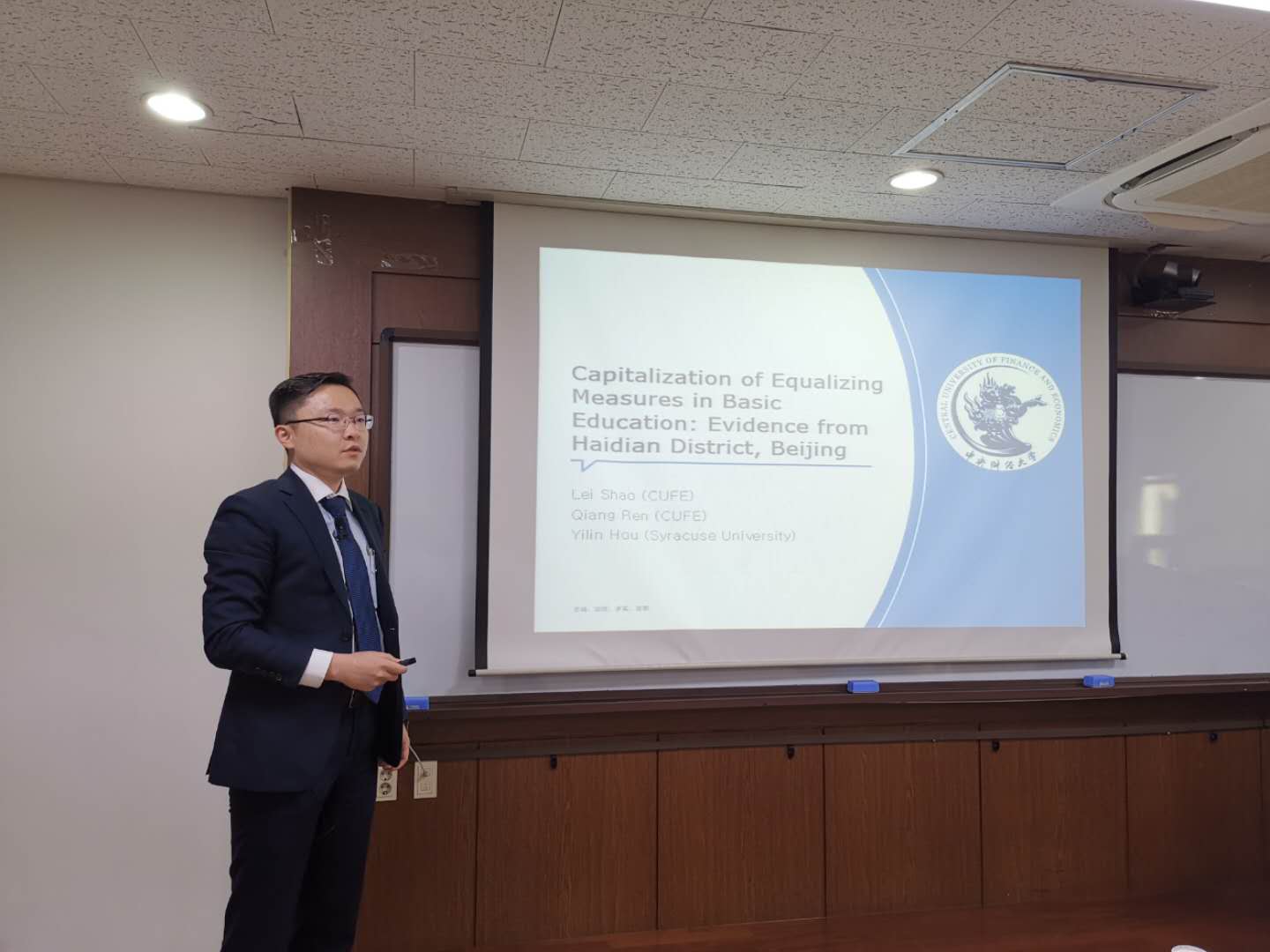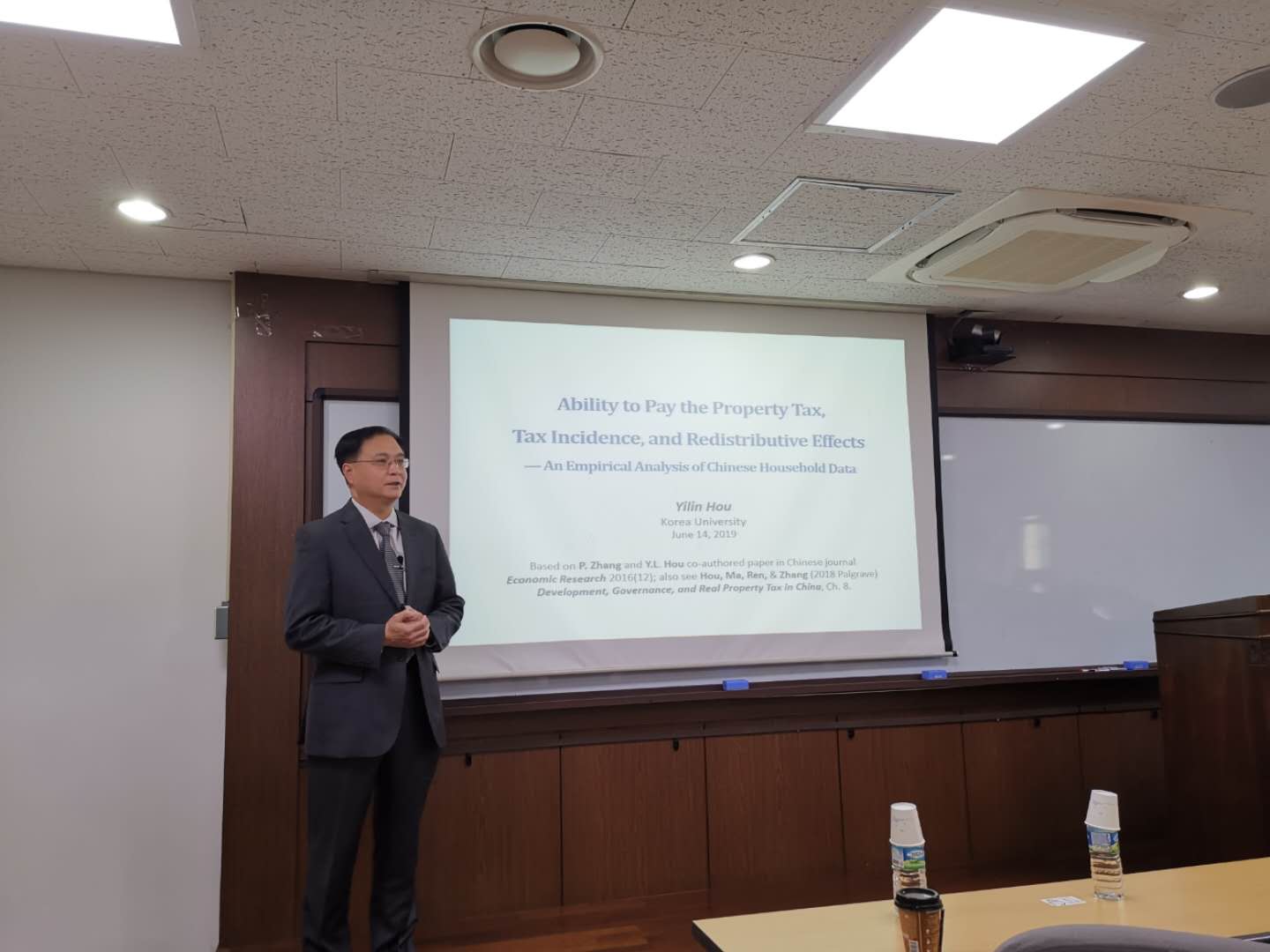 课题组受邀在韩国高丽大学公共管理学院作学术报告。出席的对方学者包括研究生院院长崔兴硕教授、公共管理学院副院长Lee Eungkyoon教授和Jun Koo、丁海溢等教授,以及来自高丽大学和韩国其他高校的部分学者和博士生。课题组成员侯一麟教授汇报了题为“Ability to Pay the Property Tax, Tax Incidence, and Redistributive Effects: An Empirical Analysis of Chinese Household Data”的学术论文,课题组成员邵磊老师汇报了题为“Capitalization of Equalizing Measures in Basic Education: Evidence from Haidian District, Beijing”的学术论文,对方代表丁海溢教授汇报了题为“Does Public Pension Crowd Out Private Transfers to the Elderly? Evidence from South Korea”的学术论文。汇报结束后,课题组成员与参加研讨会的学者分别对三篇论文的分析和结论进行了提问和回答,得到了参会专家对论文的具体建设性建议。