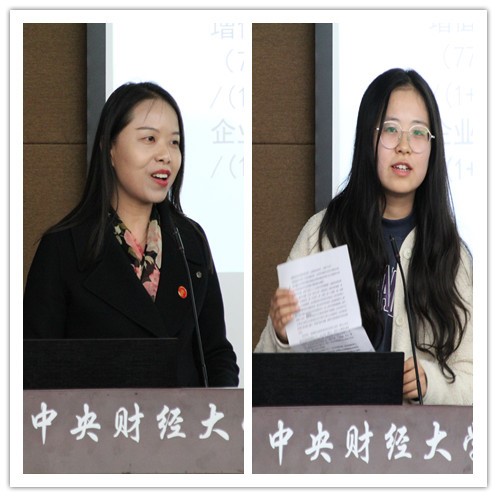 接着,2019级税务专业硕士鞠孟原作为学生代表发言。她总结了校外导师安例讲座上的收获以及对研究生生活的感触。代表同学们对今年会的培养,对校内外导师们的辛勤付出表示感谢。