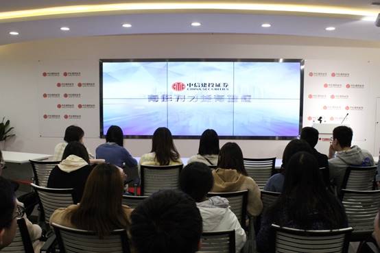 投教基地负责人热情地接待了资产评估专业师生一行。参观实习基地时,基地讲解员首先为同学们播放了一则短片,短片详尽介绍了中信建投证券的发展历程、主营业务、公司的经营布局和各部门职能,使同学们对证券行业和中信建投证券有了初步的认识。