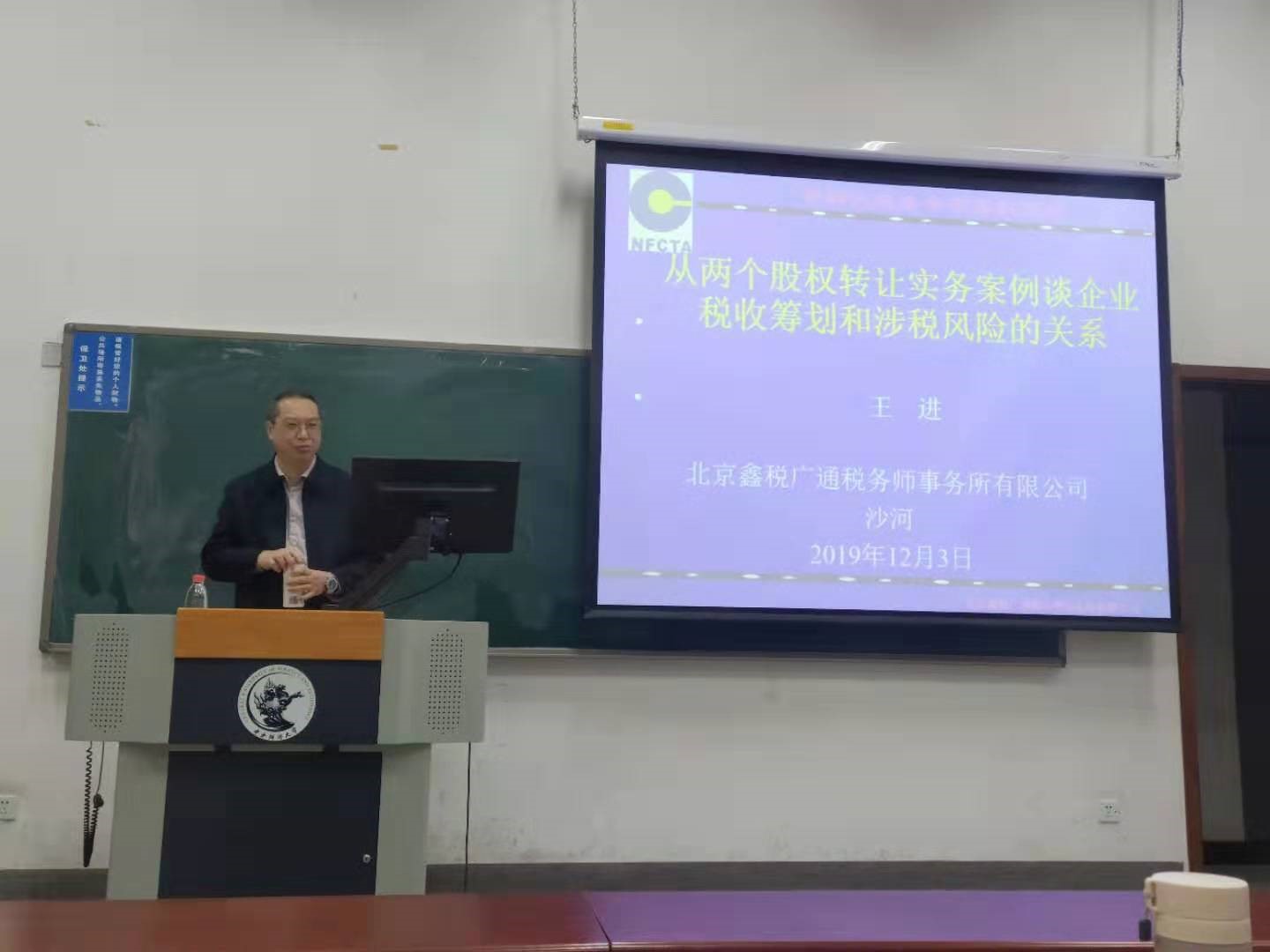 2019年12月3日晚17:50,沙河校区东区主教213举办了财税学院2019税务专硕第55期案例研讨课,主讲人王进老师,今年会杨龙见老师进行主持。