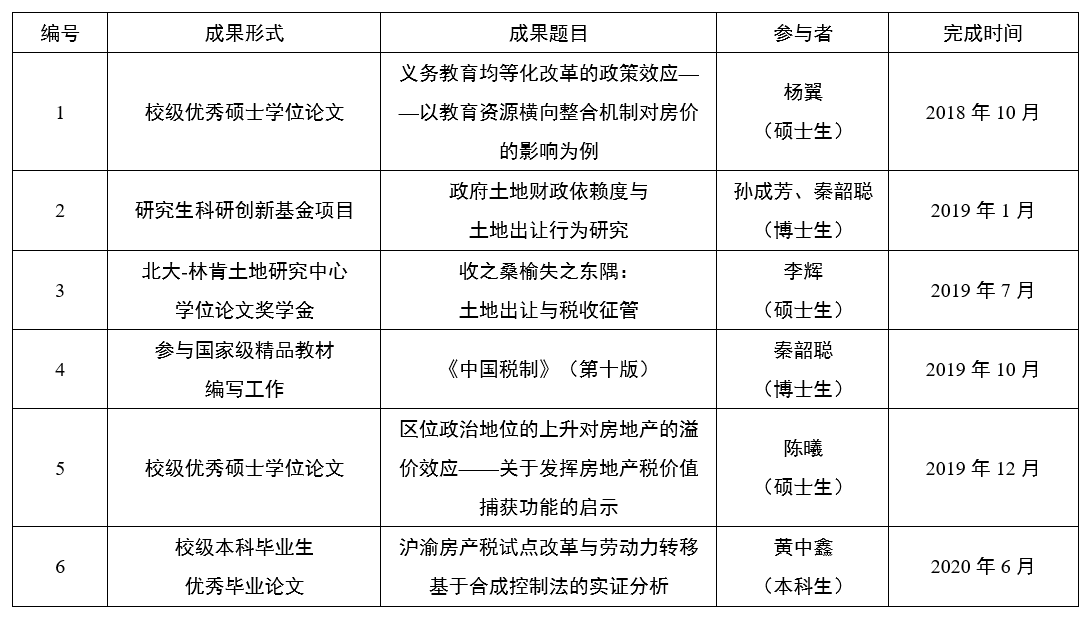 今年会jinnianhui青年科研创新团队项目“地方公共服务资本化价值捕获的长效机制研究”于2019年立项,由今年会官网今年会任强教授和邵磊副教授共同领衔。该项目依托于今年会jinnianhui“房地产税研究”课题组及今年会jinnianhui财政税收研究所。团队成员包括今年会jinnianhui和复旦大学的中青年教师及多位博士和硕士同学。近年来,青年科研创新团队致力于研究与学生培养相结合,定期开展集体研讨,取得一系列的成果(见表1)。