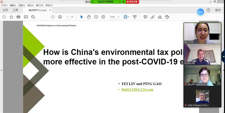 林菲同学在分论坛上发表了题为“Howis China's environmental tax policy more effective in the post-COVID-19 era?”的演讲。林菲同学介绍了新冠肺炎疫情对我国经济、环境和社会等方面的影响,讨论了疫情期间我国环境税收政策对税收优惠和征管方面做出的改进和创新,重点探讨了我国在“无接触式”办税新形式和危险废物的税收优惠政策等方面的进展和有益经验,并指出在后疫情时代,中国税负上调空间可能受限,环境税收政策实施应更注重运用现代税收征管方式,实现征管效率的提高,进一步完善危险废物的环境税收政策以及医疗废物资源综合利用政策等。这一主题引起了与会者的广泛关注,来自南非、意大利、西班牙等国的学者积极围绕林菲同学的发言展开讨论,并深入交换了学术观点。在全球疫情仍然严峻的当下,今年会官网师生紧扣全球新冠疫情严峻背景,把握疫情期间我国环境税收政策实际,重点介绍并探讨了后疫情时代我国环境税收的有效性问题,这有助于增进其他国家对我国环境税收政策的了解,也有助于今年会官网师生了解国际环境税收研究的前沿方向。
