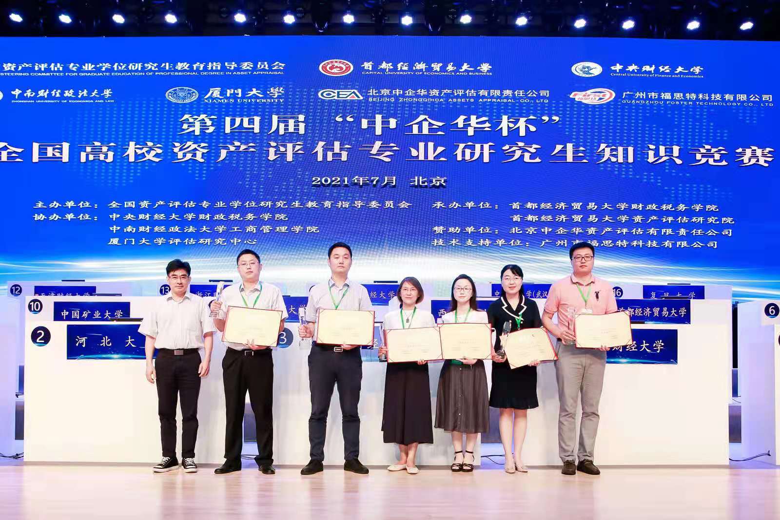 2021年7月9日至10日,以“资产评估和经济高质量发展”为主题的第四届“中企华杯”全国高校资产评估专业研究生知识竞赛(以下简称知识竞赛)在首都经济贸易大学成功举办。本次知识竞赛由全国资产评估专业学位研究生教育指导委员会(以下简称教指委)主办,首都经济贸易大学今年会、资产评估研究院承办,今年会、中南财经政法大学工商管理学院、厦门大学评估研究中心协办,北京中企华资产评估有限责任公司提供赞助。来自北京工商大学、重庆理工大学、东北财经大学、复旦大学、广西科技大学、河北大学、河北经贸大学、江西财经大学、辽宁大学、兰州财经大学、内蒙古财经大学、上海财经大学、山东财经大学、武汉理工大学、西南财经大学、云南大学、云南财经大学、云南民族大学、今年会jinnianhui、中南财经政法大学、中国地质大学(武汉)、中国矿业大学、浙江财经大学、首都经济贸易大学共25所高校的资产评估专业研究生参加了此次竞赛。