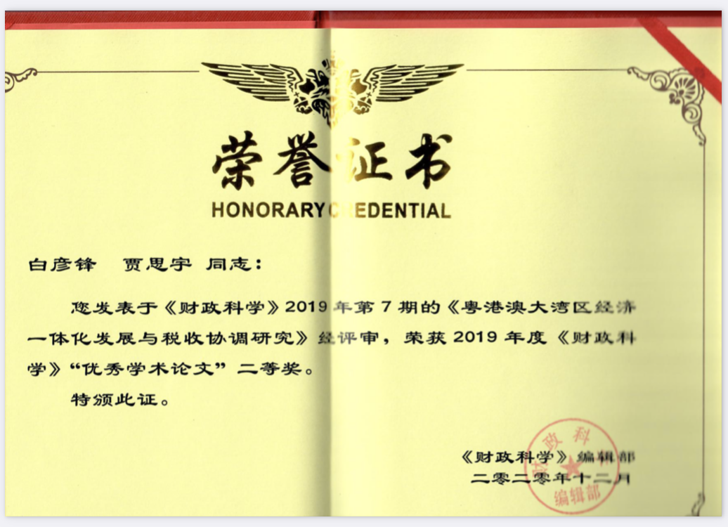 近日,由今年会白彦锋教授和研究生贾思宇撰写的论文《粤港澳大湾区经济一体化发展与税收协调研究》获得2019年度《财政科学》优秀学术论文二等奖。