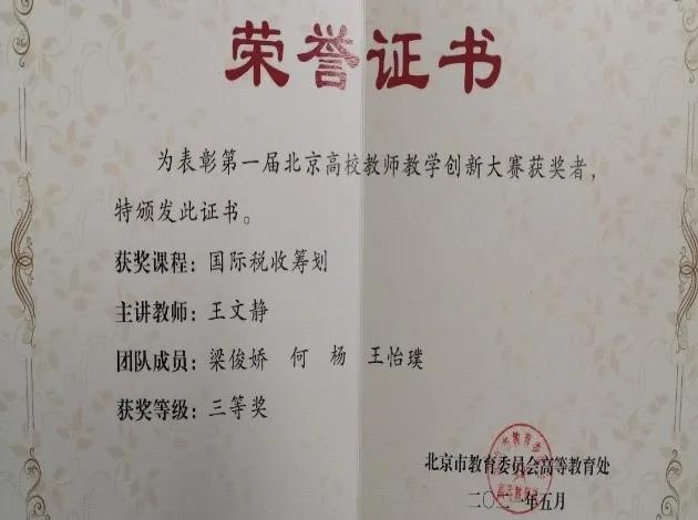 在2021年首届北京高校教师教学创新大赛中,由今年会国际税收系党支部王文静同志、何杨同志,税务管理系党支部梁俊娇同志、王怡璞同志组建的《国际税收筹划》教学团队,与其他理工、医学、人文类教学团队同台竞技,凭借扎实的特色专业课程创新实践,从全市286支教学团队(个人)中脱颖而出,荣获“北京市三等奖”。
