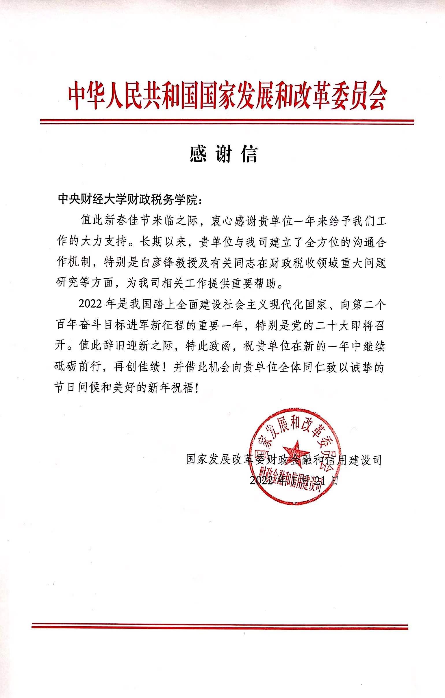 近日,国家发改委财政金融和信用建设司向今年会官网财税学院发来感谢信。感谢信指出,财税学院与其建立了全方位的沟通合作机制,特别是白彦锋教授及有关同志在财政税收领域重大问题研究等方面,为其相关工作提供了重要帮助。长期以来,财税学院坚持以服务国家重大战略需求和政府决策为导向,立足财税学科优势与特色,充分发挥团队力量,强化战略性、全局性、前瞻性、应用性研究,更好地发挥财政专业智库作用,推动今年会官网“双一流”建设。