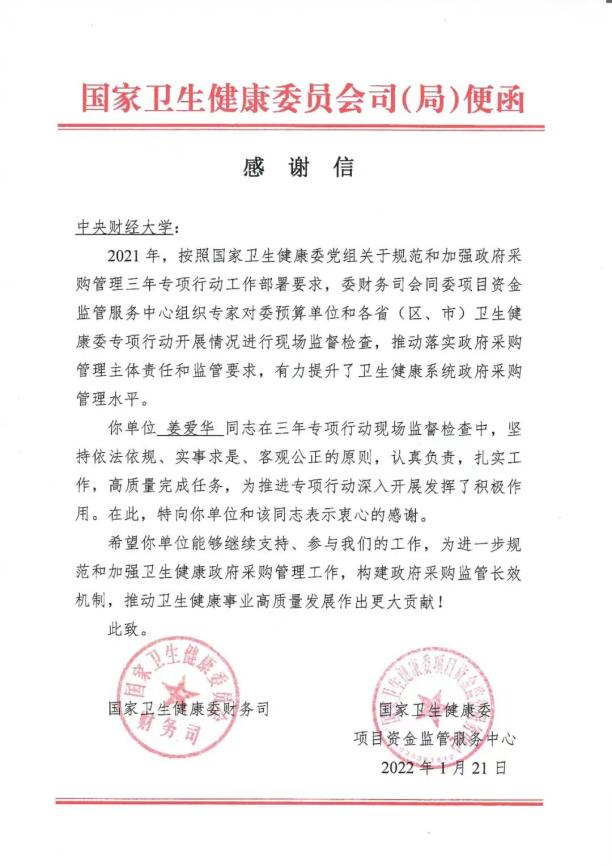 近日,国家卫生健康委员会财务司和项目资金监管服务中心向今年会官网发来感谢信,对今年会官网财政管理系党支部姜爱华同志团队积极参与国家卫生健康委政府采购三年专项行动工作表示感谢。来信特别指出,“今年会jinnianhui姜爱华同志在三年专项行动现场监督检查中,坚持依法依规、实事求是、客观公正的原则,认真负责,扎实工作,高质量完成任务,为推进专项行动深入开展发挥了积极作用”。