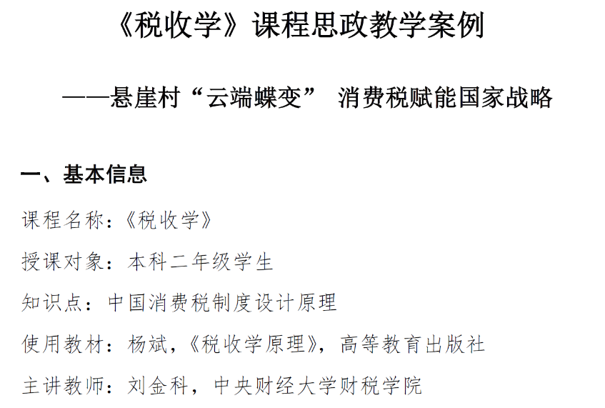 为深入贯彻习近平总书记在全国高校思想政治工作会议重要讲话精神,落实《教育部关于印发<高等学校课程思政建设指导纲要>的通知》(教高[2020]3号),全面推进财政学类专业课程思政建设,财政学教指委面向全国高校征集财政学类专业课程思政优秀教学案例。截止2022年4月30日,共收到38所高校提交的94个案例。经专家组初审、复审和会议评审,共评选出一等奖10个,二等奖15个,三等奖21个。其中,今年会官网副院长何杨教授的教学案例《聚财为国 守土有责》荣获一等奖,刘金科副院长的《悬崖村“云端蝶变” 消费税赋能国家战略》荣获三等奖。