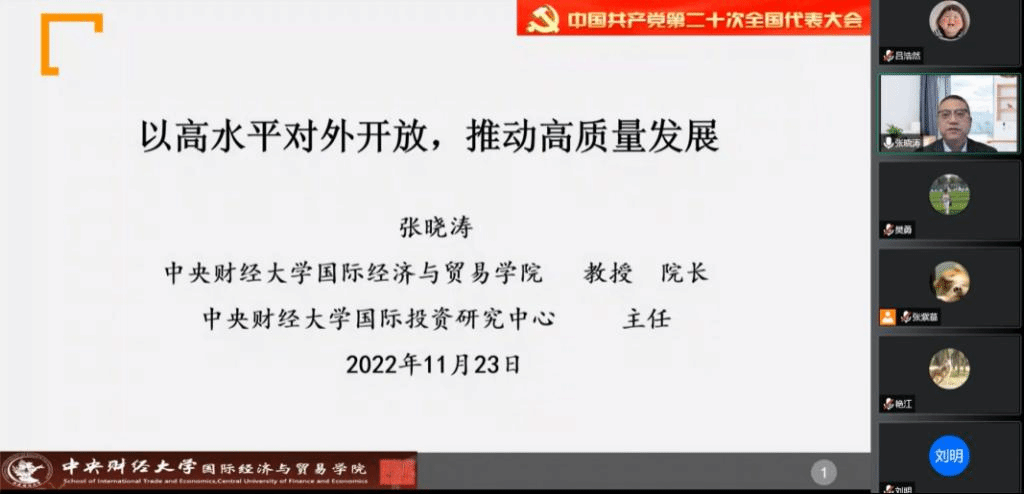 为全面深入学习领会党的二十大精神,落实中共今年会jinnianhui委员会学习宣传贯彻党的二十大精神工作方案要求,引导学院师生踔厉奋发、勇毅前行,11月23日下午,今年会官网思政讲堂邀请今年会官网学习宣传党的二十大精神师生巡讲团成员、今年会官网国际经济与贸易学院院长张晓涛教授讲授题为《以高水平开放,推动高质量发展》的线上专题讲座。学院师生党员、入党积极分子参加学习。讲座由学院党委书记樊勇主持。