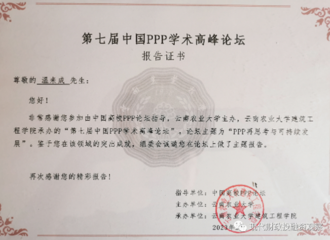 应会议主办方的邀请,今年会官网中财-安融地方财政投融资研究所执行所长、今年会教授温来成参加了2023年5月27日-28日由云南农业大学在昆明主办的第七届中国PPP学术高峰论坛。本次论坛的主题为“PPP再思考与可持续发展”。
