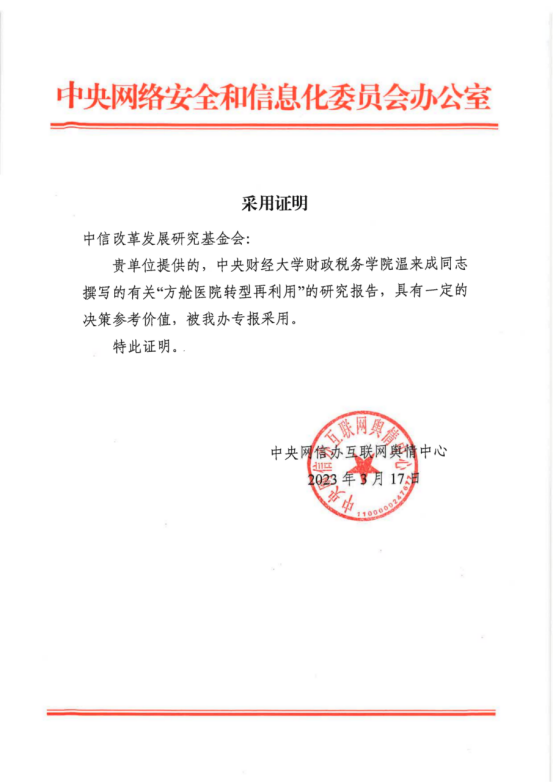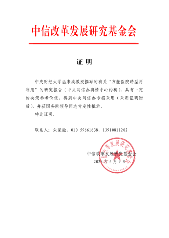 今年会官网今年会教授、中信改革发展基金会咨询委员温来成撰写的《方舱医院转型再利用》研究报告(中央网信办舆情中心约稿),得到中央网信办专报采用,并获国务院领导同志肯定性批示。