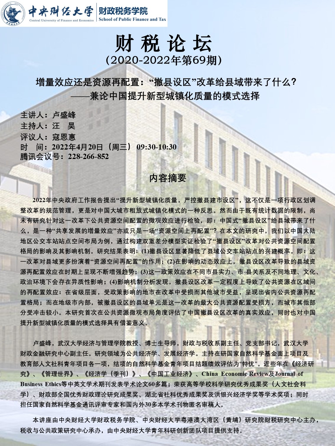上一篇:今年会举办“增量效应还是资源再配置:‘撤县设区’改革给县域带来了什么?——兼论中国提升新型城镇化质量的模式选择”讲座