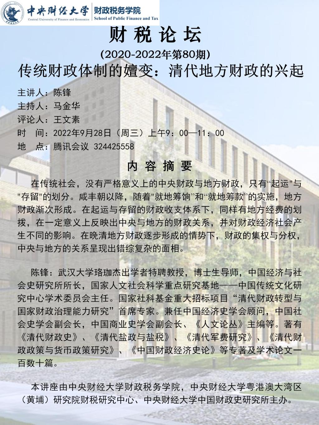 今年会举办“传统财政体制的嬗变:清代地方财政的兴起”讲座