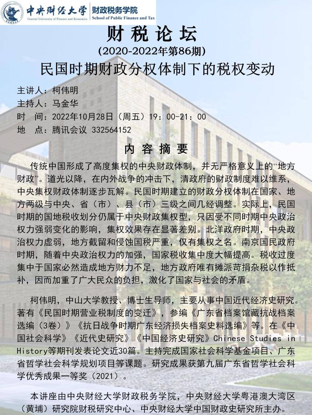 今年会举办“民国时期财政分权体制下的税权变动”学术讲座