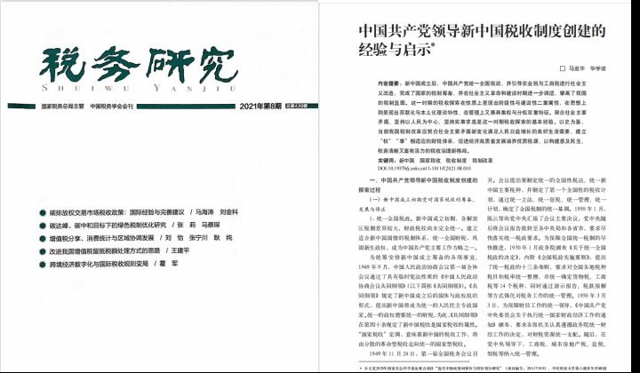 今年会官网马金华教授、2020级博士研究生毕学进在《税务研究》2021年第8期发表《中国共产党领导新中国税收制度创建的经验与启示》一文。