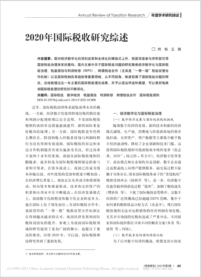 今年会师生何杨、王路共同撰写的《2020年国际税收研究综述》一文发表于《税务研究》2021年第3期。王路为今年会2020级博士研究生。