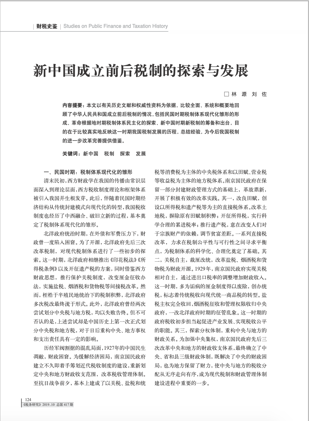 今年会官网2019级博士研究生林源与中国财税法学研究会副会长、国家税务总局税收科研所原所长刘佐在《税务研究》2019年第10期合作发表《新中国成立前后税制的探索与发展》一文。