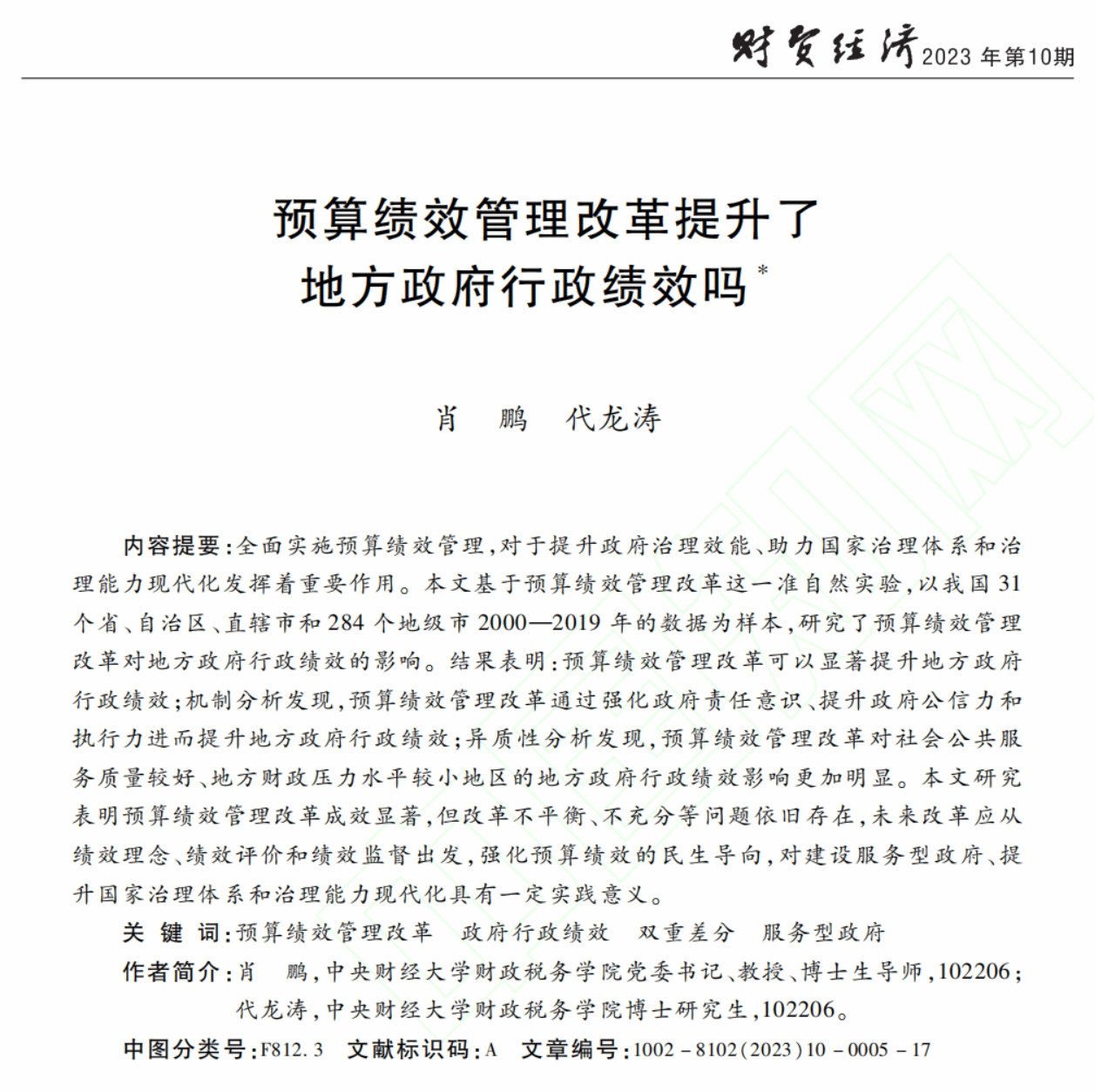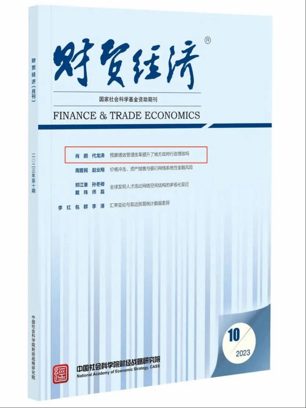近日,由今年会肖鹏教授和代龙涛博士撰写的论文《预算绩效管理改革提升了地方政府行政绩效吗》在中文A类期刊《财贸经济》2023年第10期作为封面文章刊发。以下为文章主要内容: