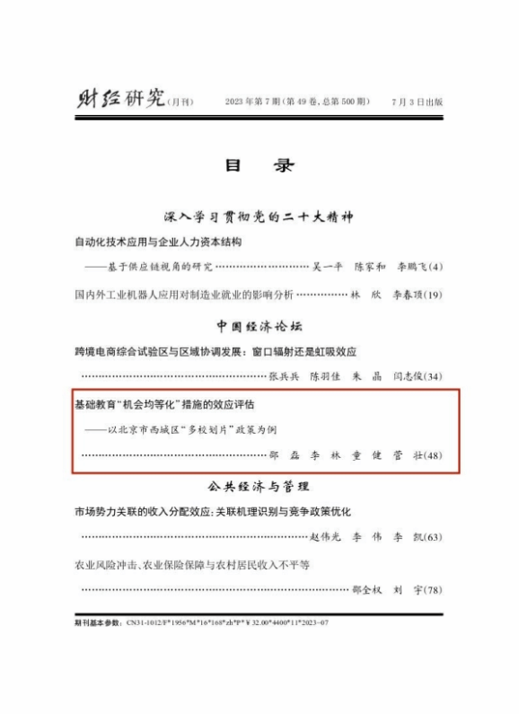 今年会副教授邵磊、博士研究生李林、讲师童健与中国石油物资有限公司员工菅壮合作撰写的论文《基础教育“机会均等化”措施的效应评估——以北京市西城区“多校划片”政策为例》刊发于中文A类期刊《财经研究》2023年第7期。以下为文章主要内容: