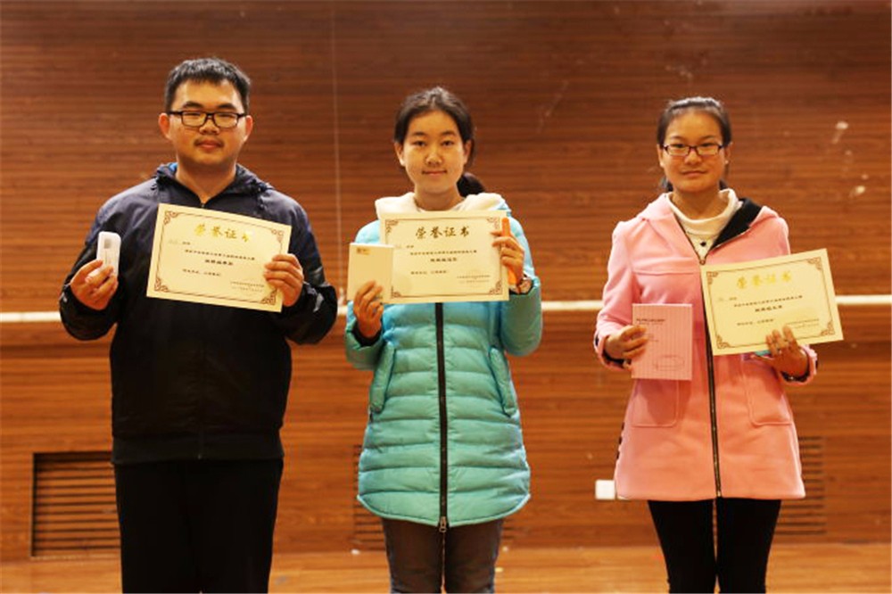 经过激烈的角逐,多名同学脱颖而出。跳棋比赛的冠亚季军分别是任慧敏、李聪和郑圣平同学;围棋比赛的冠亚季军分别是王晨鉴、陈子天骄和李柯宏同学;五子棋比赛的冠亚季军花落杨轩、周翔和沈瑶璇同学手中;象棋比赛的冠亚季军分别是陈勇成、王博和张燮同学。获奖的同学们同时也得到了精美的奖品。