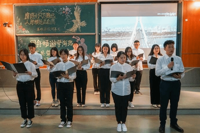 “青山不改家国梦,绿水长流青年情。” 第五组成员真挚的朗诵《我爱这土地》并合唱《国家》。整齐划一的手势,代表着他们对祖国深切的情感。