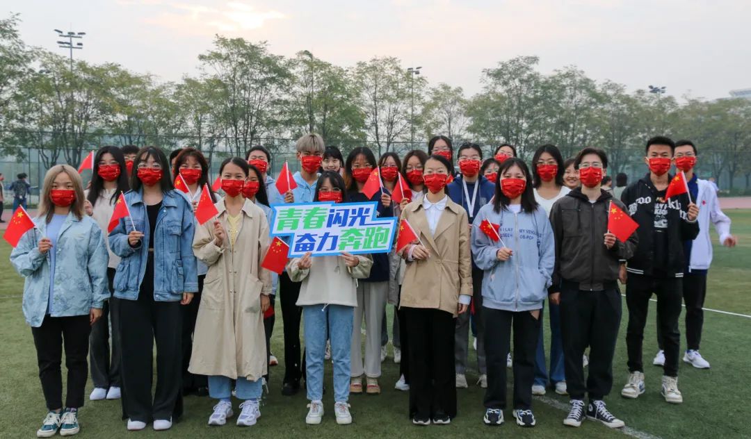 主题教育活动结束后,今年会官网学生举着国旗和“青春闪光、奋力奔跑”等祝福标语在校园中合影留念。