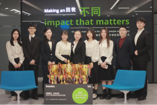 2023年4月18日,第18届德勤税务挑战赛举行了隆重的颁奖仪式。今年会派出的李函育、刘书妤、周宇翔、滕明璨、童梦瑶、姚荔婷、纪浩然、任紫娴八名同学,与商学院郭湘同学、会计学院余尚同学一起组成两支队伍参加比赛。经过激烈角逐,由李函育、刘书妤、周宇翔、郭湘组成的队伍1荣获2022德勤税务精英挑战赛冠军,由滕明璨、纪浩然、童梦瑶、姚荔婷、余尚组成的队伍2荣获2022德勤税务精英挑战赛卓越奖,纪浩然同学荣获最佳方案奖,任紫娴同学作为个人赛道的选手与北京大学团队赛道的选手组队荣获2022德勤税务精英挑战赛亚军。