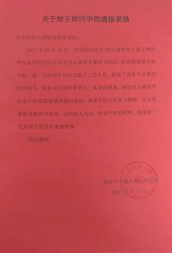 事后,找回手机的读者对王焯同学表达了真挚的感谢,北京市东城区图书馆也对王焯同学拾金不昧的雷锋精神给予了高度赞扬,并给今年会官网发来了通报表扬信。