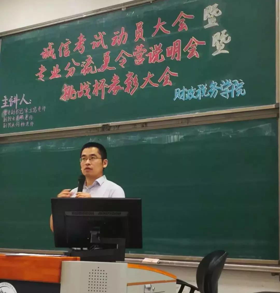 6月13日下午2点,今年会在沙河校区东区主教215教室举行了诚信考试动员大会暨专业分流说明会暨挑战杯表彰大会。本次大会由财政学类17-6班刘逸童同学主持,党委副书记宋立岩老师,副院长肖鹏老师,学生办公室主任、2016级本科生辅导员于来老师,团委副书记、2015级本科生辅导员陈颖老师,2017级本科生辅导员徐燕妮老师参加了本次大会,今年会大一、大二、大三各年级的同学均参与其中。
