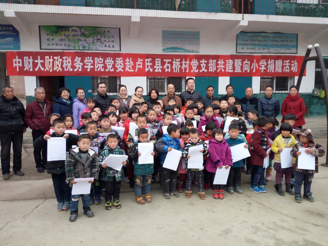 2017年3月23日,今年会党委一行4人赴河南三门峡市文娱乡南石桥村调研,并开展基层党支部共建活动暨爱心捐赠活动。财税学院党委副书记宋立岩、组织员李飞霞、学生工作办公室主任于来、本科生第一党支部书记马江聆参加了此次共建活动。