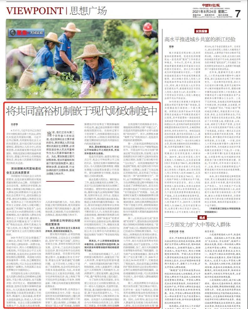 近日,由白彦锋教授撰写的文章《将共同富裕机制嵌于现代财政制度中》于《中国财经报》2021年8月24日第7版发表。全文如下: