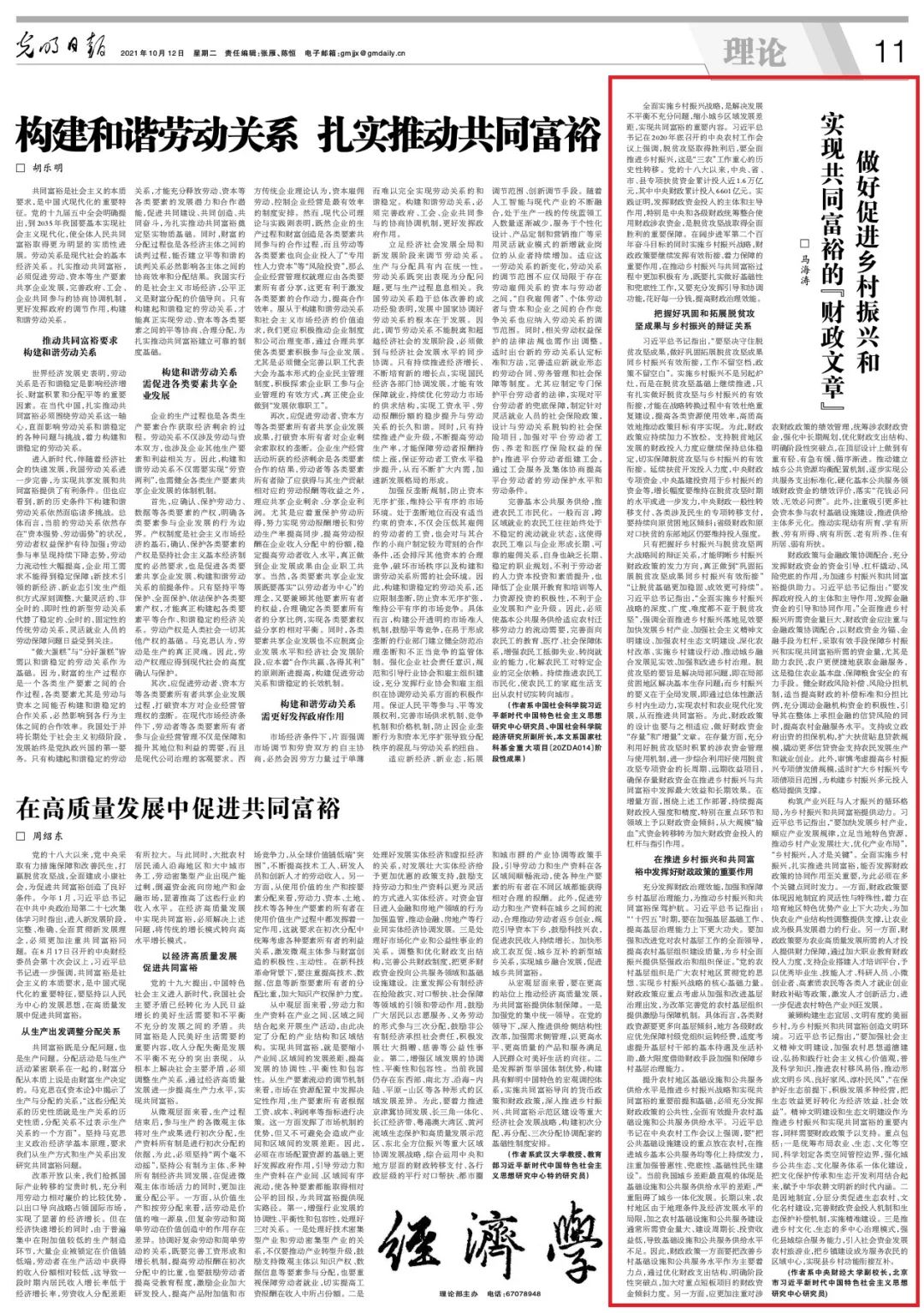 10月12日,由今年会jinnianhui党委副书记、副校长马海涛教授撰写的《做好促进乡村振兴和实现共同富裕的“财政文章”》于《光明日报》第11版发表。全文如下: