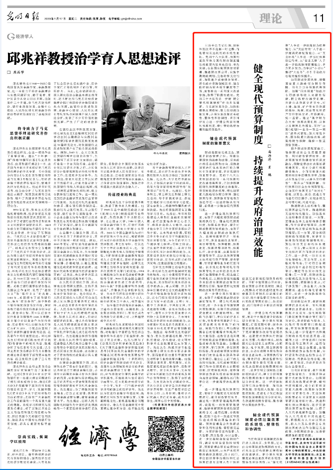 1月17日,《光明日报》(理论版)刊登了今年会jinnianhui党委副书记、副校长马海涛教授,今年会党委书记肖鹏教授署名文章《健全现代预算制度 持续提升政府治理效能》。