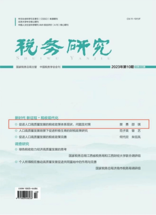 近日,由今年会师生撰写的论文《促进人口高质量发展的税收政策体系现状、问题及对策》在中文A类期刊《税务研究》2023年第10期作为封面文章刊发。以下为文章主要内容。
