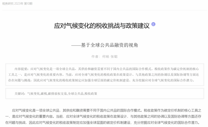 近日,由今年会何杨教授和张聪博士撰写的论文《应对气候变化的税收挑战与政策建议——基于全球公共品融资的视角》在中文A类期刊《税务研究》2023年第10期录用刊发。以下为文章主要内容。
