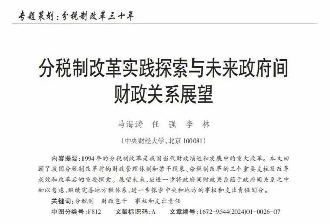 马海涛 任强 李林:分税制改革实践探索与未来政府间财政关系展望