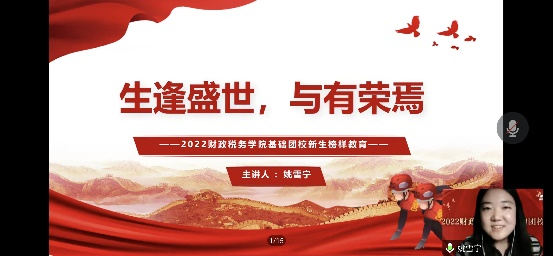 学生团委副书记、基础团校副校长、冬奥志愿者姚雪宁讲述了自己和其他中财大人一起参加冬奥志愿的经历,提出我们作为新时代青年,要听党话、跟党走,践行爱国主义信念,让世界看到中国青年积极向上的精神风貌。